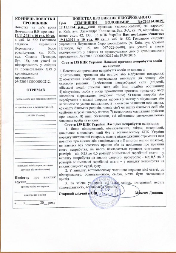 Демчишина викликають до слідчого Державного бюро розслідувань на 10:00 19 листопада 2021 року.