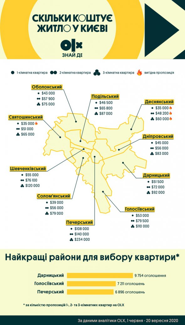 У спальному Оболонському районі придбати однокімнатну квартиру у середньому коштує $43 тис. У Дніпровському - $45 тис. Це на 13% більше, ніж було торік. Водночас за рік кількість оголошень про продаж суттєво зросла. У Подільському районі за однокімнатне житло треба заплатити $46,5 тис, у Дарницькому - $51,5 тис. Щоправда 2019-го просили $40,4 тис.