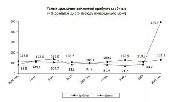 "Загальний прибуток підприємств склав 199,9 млрд гривень, що на 131,1% більше в порівнянні із січнем-березнем 2019 року. Але при цьому було допущено збитків на суму 204,8 млрд гривень. Це на 495,1% більше в порівнянні з аналогічним періодом минулого року", - зазначається в повідомленні.