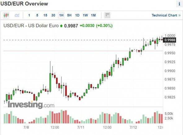 Курс євро на міжнародному ринку зрівнявся з доларом уперше з грудня 2002 року.