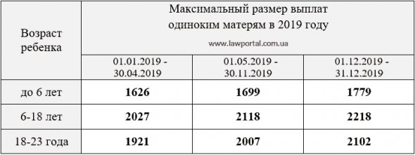 У 2019 році виплати одиноким матерям не зростуть. Становитимуть різницю між 100% прожиткового мінімуму для дитини відповідного віку та середньомісячним сукупним доходом сім'ї в розрахунку на одну особу за попередні 6 місяців.
