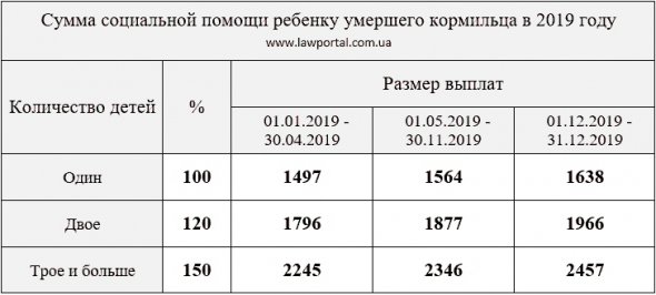 Виплати залежать від страхового стажу та заробітку померлого годувальника. Якщо у нього не було необхідного страхового стажу для призначення пенсії у зв'язку з втратою годувальника, його дітям може бути призначена державна соцдопомога. Гроші виплачуються щомісяця до досягнення дитиною повноліття. Студентам допомога по втраті годувальника надається до закінчення навчання, але не довше ніж до досягнення 23 років. Сума державної соцдопомоги по втраті годувальника в 2019 році встановлюється виходячи з розміру прожиткового мінімуму для осіб, які втратили працездатність: