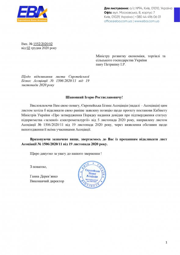 Європейська бізнес асоціація (ЄБА) 2 грудня 2020 року відкликала свій лист на адресу міністра економіки Ігоря Петрашко, в якому було піддано критиці надання фінансових стимулів для екологічної модернізації промислових підприємств, зокрема - "зеленої" металургії.