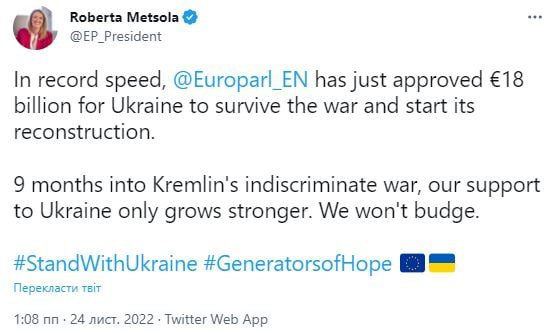 Європарламент на засіданні 24 листопада затвердив виділення 18 млрд євро допомоги Україні. Кошти спрямовані на допомогу українцям пережити війну та відновитися після обстрілів.