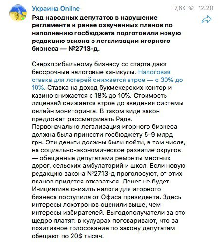 Як повідомляє telegram-канал Україна Online, спочатку від легалізації азартних ігор планували отримати до бюджету 5-9 млрд грн. Ці гроші повинні були піти, в тому числі, на соціально-економічний розвиток округів - обіцяні депутатами ремонти місцевих доріг, сільських амбулаторій та шкіл. Якщо Рада проголосує на нову редакцію закону №2713-д, від цих планів доведеться відмовитися - грошей не буде.