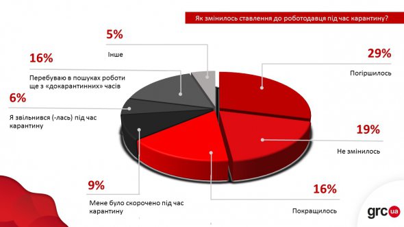 Не відчули змін 19% респондентів. Водночас 16% стверджують, що компанії стали уважнішими та покращили умови під час карантину, свідчать результати опитування grc.ua.