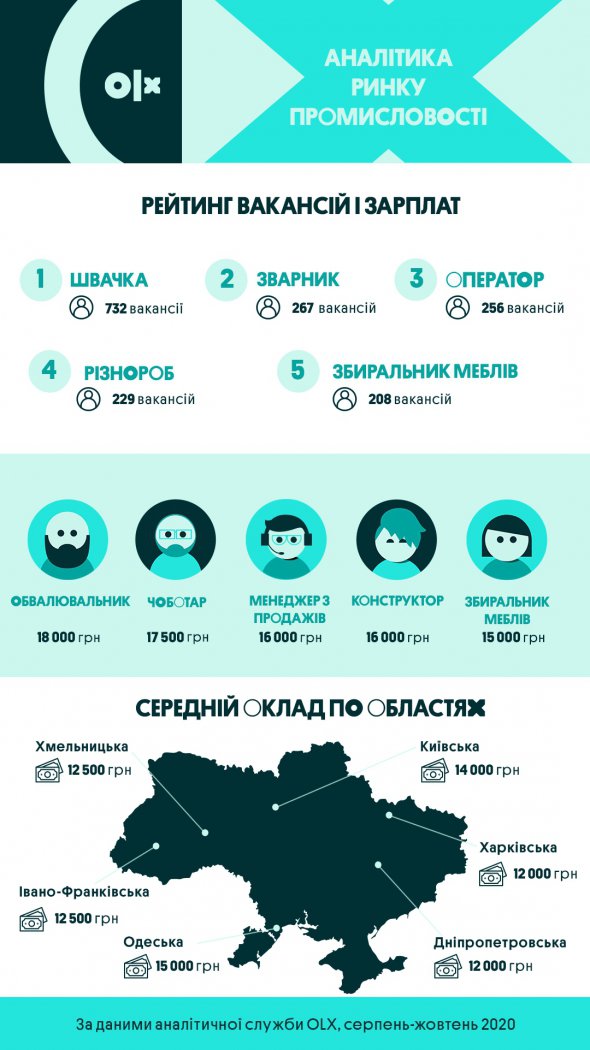 "За даними Держстату, у жовтні 2020 року обсяги промислового виробництва в країні скоротилися на 3,9% порівняно з аналогічним місяцем минулого року, а порівняно з вереснем 2020 – зросли на 5,8%. Якщо говорити про скорочення у галузях, найменше воно торкнулося виробництва одягу, шкіри, виробів зі шкіри та інших матеріалів – 7,6%, а також виробництва харчових продуктів, напоїв – на 2,7%. У той же час зросли обсяги виробництва м'яса. Все це обумовлює високий попит на обвалювальників та швачок в країні", — коментує керівник напряму OLX Робота в Україні Марія Абдулліна.