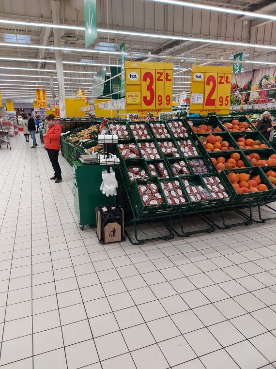 Кілограм цукру у Польщі в середньому обійдеться у 10 грн. Кілограм курячого філе 64 грн. Свиняче філе 120 грн. Буханка хліба тут 22, 5 грн. Дорогі також свіжі овочі. Пів кілограма помідор черрі 67 грн, але звичайні рожеві будуть коштувати стільки ж за кілограм. Так само буде коштувати кілограм перцю. Польські яблука коштують 29 грн, стільки ж обідеться кілограм апельсинів.