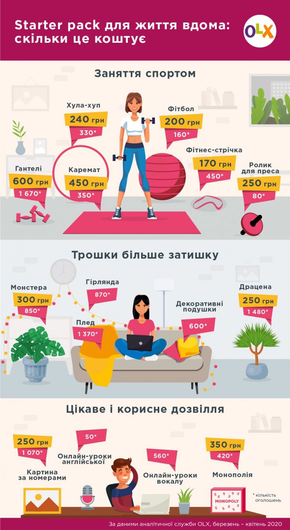 Хула-хуп продають по 240 грн. М'яч для фітнесу для домашніх тренувань можна знайти у середньому за 200 грн. Каремат для тренувань чи килимок пропонують купити за 450 грн, передає olx.ua.