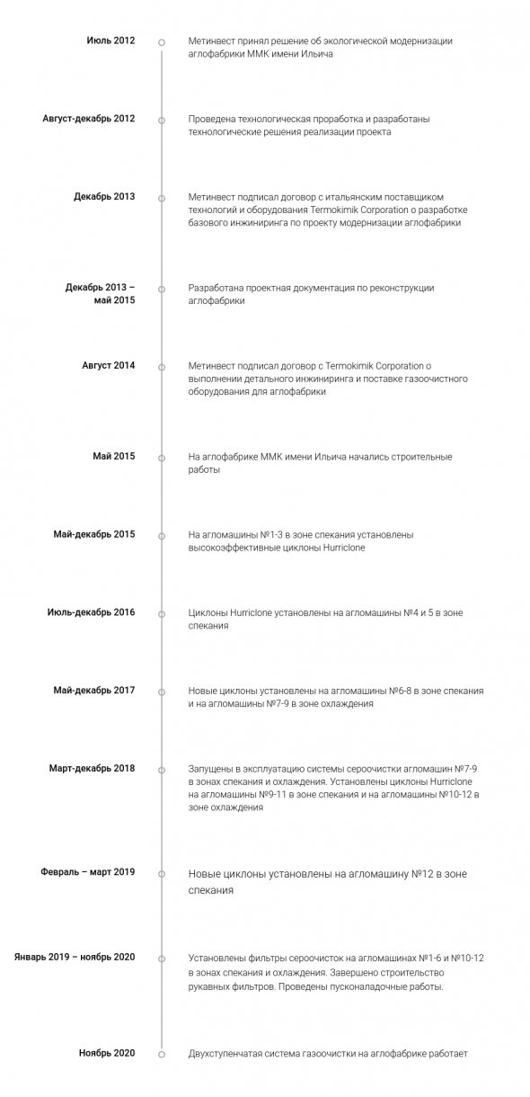 Велике будівництво на комбінаті імені Ілліча тривало п'ять з половиною років. Увесь цей час команда з українців та італійців працювала над модернізацією обладнання на діючому виробництві. Монтаж циклонів і рукавних фільтрів - конструкцій вагою сотні тонн - проводили в рекордно короткі терміни. У всьому світі зараз не будують настільки масштабних систем газоочисток на аглофабриках. І все для того, щоб жодна з п'яти труб аглофабрики не затьмарювала маріупольське небо.