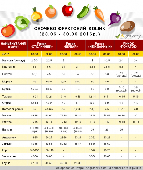 Моніторинг проводився на 4-ох гуртових ринках. На найбільшому плодоовочевому — Нежданний в селі Великі Копані Цюрупинського району на Херсонщині, на якому в сезон купують продукцію з усіх регіонів; київському ринку Столичний — найдорожчому серед усіх гуртових, львівському ринку Шувар — головному продовольчому торговому майданчику західноукраїнських областей та ринку Початок в Одесі.