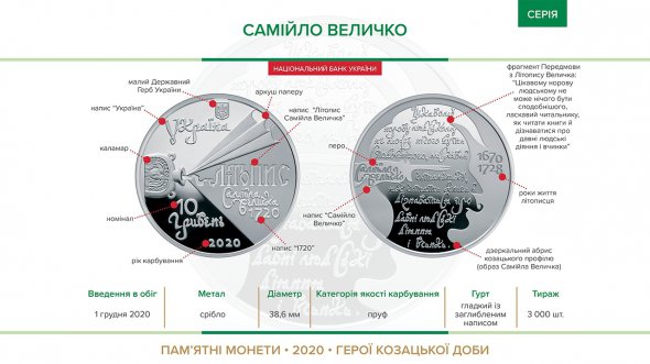 Пам'ятна монета "Самійло Величко" присвячена козацькому літописцю, автору фундаментального історичного трактату, що висвітлює події української історії середини XVII – початку XVIII ст. Монета буде виготовлена зі срібла, тираж – 3 тис. шт. Вона вийде в рамках серії "Герої козацької доби".