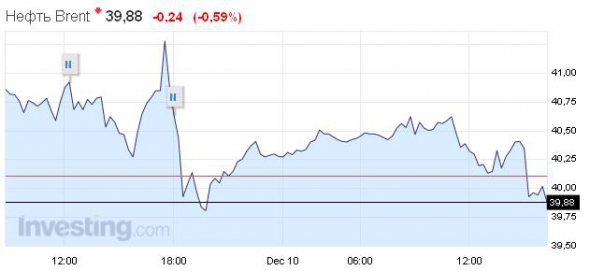 Станом на 16.25 четверга, 10 грудня, січневий ф'ючерс на нафту марки Brent на Лондонській біржі втратив у ціні 0,59% і опустився до 39,88 дол. за барель, свідчать дані торгів.