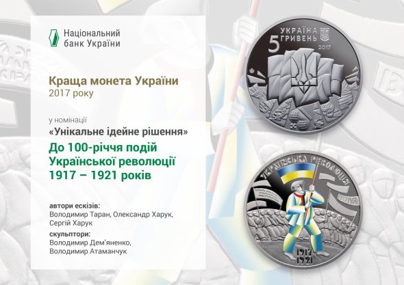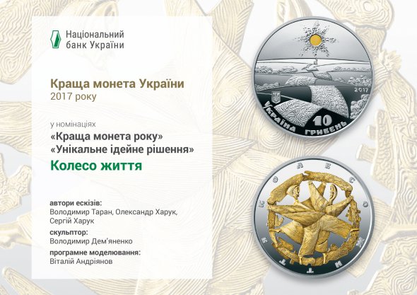 У номінації "Унікальне ідейне рішення" перемогли одразу дві монети: "Колесо життя" та "До 100-річчя подій Української революції 1917-1921 років". Остання виготовлена з нейзильберу, має номінал 5 гривень.
