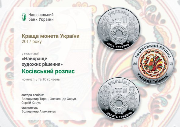 У номінації "Найкраще художнє рішення" перемогу здобула монета "Косівський розпис". Номінал монети — 5 і 10 гривень. Виготовлені з нейзильберу та срібла.