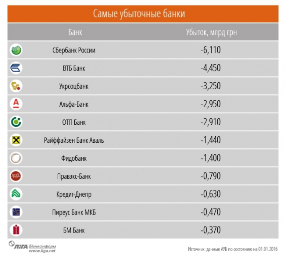 "Асоціація українських банків" (АУБ) опублікувала попередні дані про фінансові результати банків-учасників за 2015 рік. До асоціації входять 78 з 116 діючих банків. Серед членів АУБ найзбитковішим банком став російський "Сбербанк Росії", який втратив 6,1 млрд грн. Слідом за ним йде ще один банк з російським капіталом, "ВТБ Банк". Його збитки склали 4,45 млрд грн. Замикає трійку найзбитковіших банків "Укрсоцбанк". Його фінансовий результат за підсумками 2015 року впав до -3,2 млрд грн.