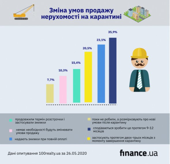 За час карантину на ринку нерухомості кількість угод у 43,6% компаній упала на більш як 50%. На 2,6% показники скоротилися у 17,6% компаній.