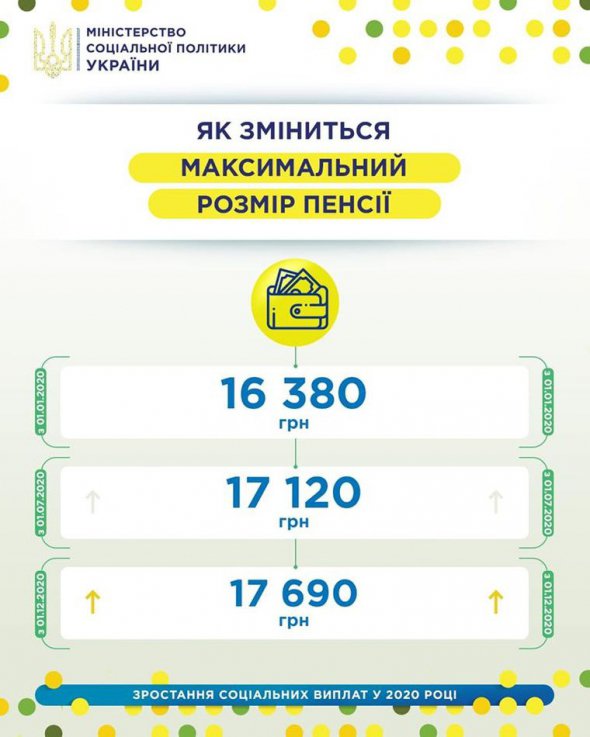 З 01.01.2020 максимальна пенсія виросла і становить 16380 грн; з 01.07.2020 - буде 17120 грн; з 01.12.2020 - 17690 грн.