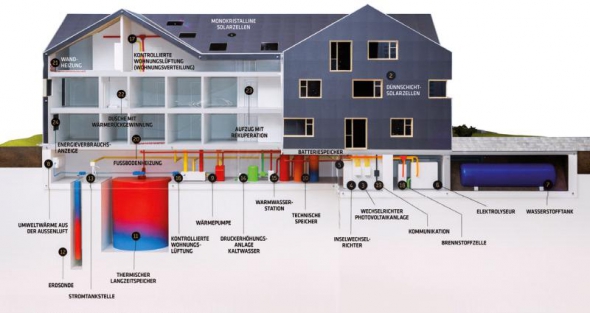 "Будинок майбутнього" вже побудований (у передмісті Цюріха в містечку Brütten), більше того зданий в експлуатацію і успішно функціонує, квартири в ньому здані в оренду за цілком конкурентну плату, вже є перші схвальні відгуки орендарів. Енергетична і інженерна концепція автономного будинку проста і логічна. По-перше, потужно утеплені зовнішні стіни та покрівля, використані дуже теплі вікна. Це забезпечує максимально ефективне збереження і ощадливе використання енергії, яку "будинок виробляє сам". Саме так - до електричних мереж і до зовнішніх джерел тепла будинок не підключений. Виробництво енергії здійснюється сонячною електростанцією потужністю 126,5 кВт, і ця сонячна електростанція займає весь фасад і всю покрівлю будівлі. Вироблена електроенергія покриває всі потреби Будинку майбутнього. Надлишкова енергія направляється на короткострокове зберігання в літій-іонні акумулятори ємністю 192 кВтг. Максимальний надлишок виробленої електрики, що виникає в літню пору року, йде на тривале зберігання. Для цього за допомогою електролізу виробляється водень, який зберігається в спеціальних ємностях загальним обсягом 120 м3 під тиском до 30 атм. Тепло виробляється за допомогою геотермального теплового насоса потужністю 28 кВт (два зонда по 338 м вглиб). У підвалі розташовані гігантські ємності для зберігання тепла, з потужною ізоляцією завтовшки 20 см.