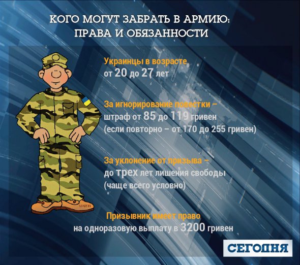 В армію забирають українців від 20 до 27 років. Солдати, матроси, сержанти і старшини служитимуть 18 місяців. Призовники з вищою освітою — 12 місяців.