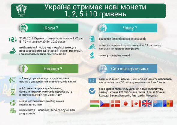 З 27 квітня в Україні з'являться нові монети номіналом 1 і 2 гривні. Згодом вони повністю витіснять паперові купюри. Їх спеціально не вилучатимуть, а припинять друкувати. До 2010-го з'являться монети в 5 і 10 гривень.