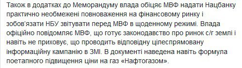Також, за його словами, в додатках до меморандуму "влада обіцяє МВФ надати Нацбанку практично необмежені повноваження на фінансовому ринку і зобов'язати НБУ звітувати перед МВФ в щоденному режимі".