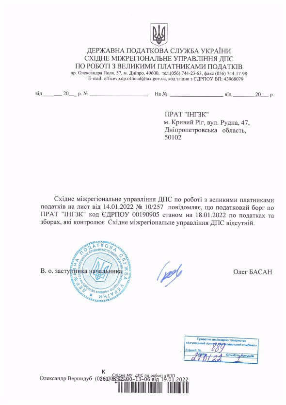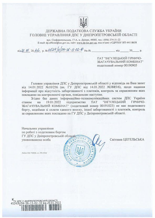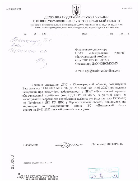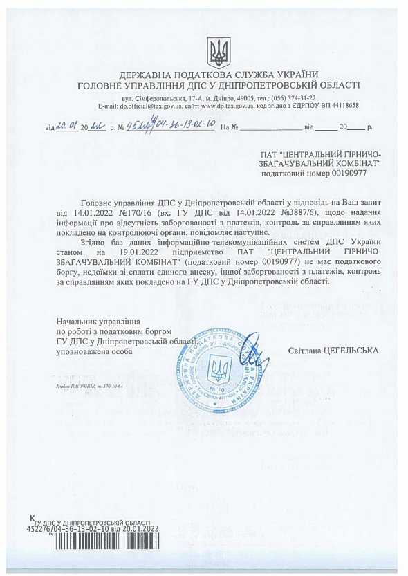 Податкові органи підтвердили відсутність заборгованості на Північному, Інгулецькому і Центральному гірничо-збагачувальних комбінатах групи компаній "Метінвест", на яких правоохоронні органи проводили обшуки 1 лютого через нібито податкові порушення.
