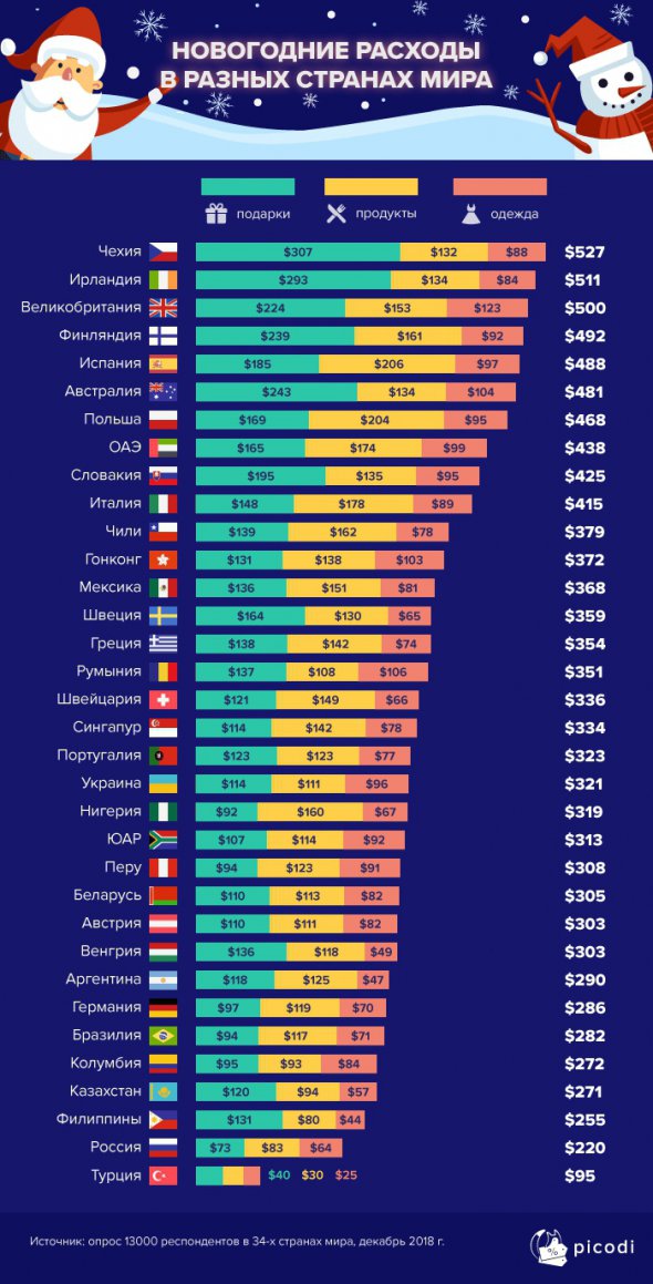 Менше $100 на новорічні свята витратять у Туреччині. На подарунки і продукти турки відклали $40 і $30 відповідно. Росіяни запланували витратити на новорічний стіл, одяг і подарунки $220.