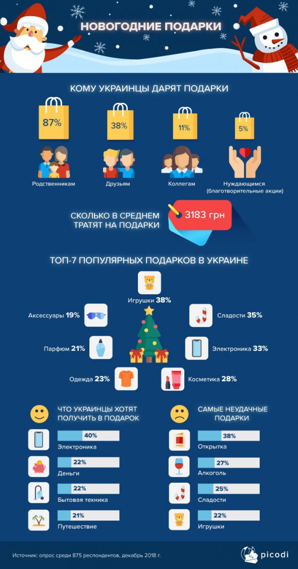 На подарунки українці у середньому відклали 3183 грн. Найчастіше дарують їх родичам, друзям чи колегам. До переліку найбажаніших подарунків увійшли електроніка, гроші, побутова техніка та подорожі. Менш за все українці хочуть отримати "під ялинку" алкоголь, солодощі та іграшки.