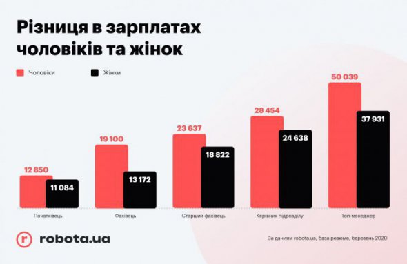 В Україні більша частина керівників — чоловіки. Тільки кожне п'яте резюме жінки претендує на керівну посаду. За свою роботу чоловіки хочуть отримувати більше, ніж жінки. Постійно прагнуть кар'єрного зростання. Тому на спеціальностях початкового рівня переважно працюють жінки.