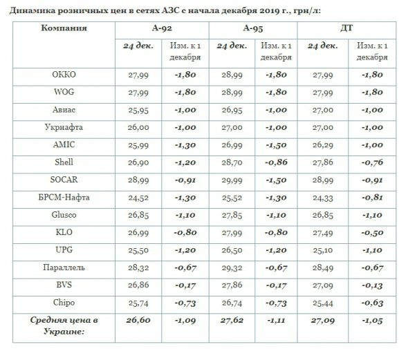 24 грудня бензини у великих мережах подешевшали від 50 коп. до 1 грн за літр. За день до цього президент Володимир Зеленський закликав трейдерів замість програм лояльності знизити ціни на табло.