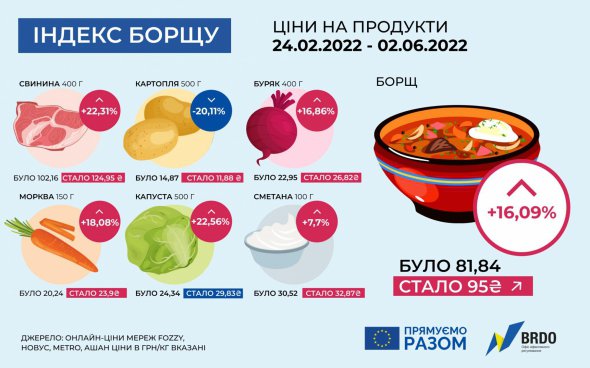 За 100 днів повномасштабної російскьої агресії вартість борщу в Україні зросла на 16,09 %.