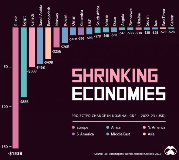 Лідером зі скорочення економіки є Росія, яка втратить до кінця 2023 року $150 млрд у порівнянні з показниками минулого року. Це становить близько третини від загального спаду економік 29 країн.