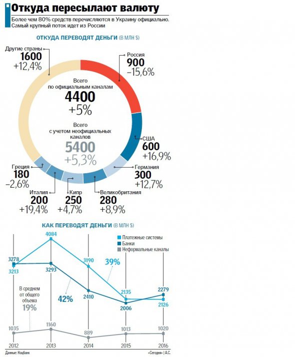 Найбільший потік валюти йде з Росії. Хоча за рік він істотно зменшився - майже на $200 млн. У НБУ це пояснюють рішенням РНБО України від 16 вересня 2016 року про заборону використання російських платіжних систем. РФ з березня заборонила грошові перекази в Україну через іноземні платіжні системи, тому експерти очікують подальшого різкого скорочення потоку валюти (принаймні офіційного) з Росії.