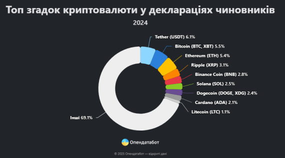 Найпопулярнішим цифровим активом серед посадовців є Tether (USDT) - його вказали 802 чиновники. Bitcoin (BTC, XBT) стабільно тримається на другому місці - 731 декларація. Ethereum (ETH) задекларували 713 держслужбовців.