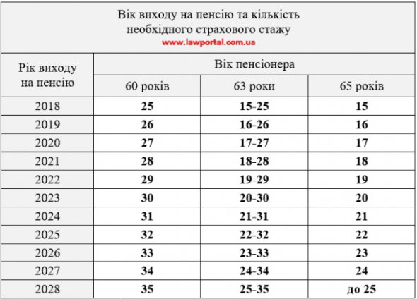 Скажімо, ті, кому 63 роки виповнилося в 2019 році, можуть отримати пенсію за віком при наявності страхового стажу від 16 років. У 2020-му потрібен стаж не менше 17 років, у 2021-му - не менше 18 років, у 2022-му - від 19 років і більше. Українці, яким у в 2020 році тільки виповниться 60, зможуть піти на пенсію в 2023 році, якщо до того моменту їх страховий стаж становитиме не менше 20 років.