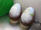 "Найдорожчі яйця у 3D. Вони важать 600 грам. Вчора цілий день їх розмальовували з колегою, - розповідає художник Наталя, 27 років. - Сьогодні їх порозбирали, бо перед Великоднем на них високий попит. Яйця вилиті у кілької площинах — випуклі назовні, мають вм'ятини всередину".