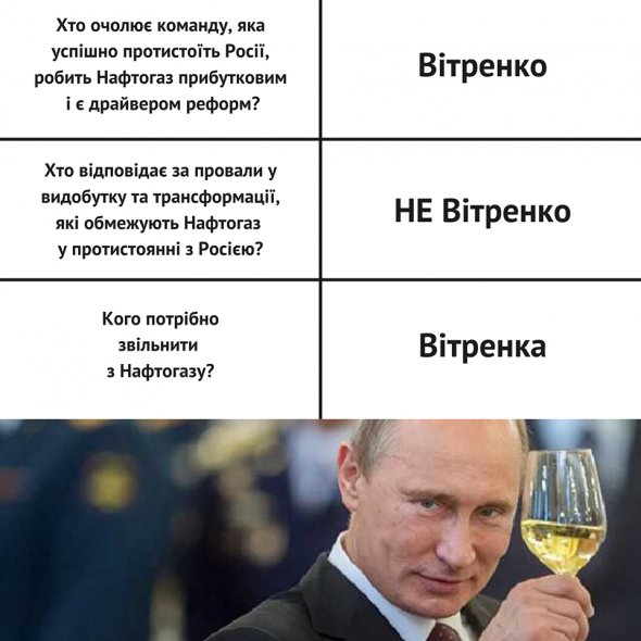 "Найбільш логічне пояснення, чому мене звільняють - зараз не є пріоритетом боротьба проти російської агресії, зокрема ефективний захист інтересів України у відносинах із Газпромом. Так само не є пріоритетом боротьба з корупцією, зокрема з її причинами в газовому секторі. Виходить, є інші пріоритети, які, на жаль, стали бар'єром на шляху зближення з Європою, зміни правил всередині країни на європейські, примушення Росії грати за цивілізованими правилами по відношенню до України", - написав Вітренко у Facebook.