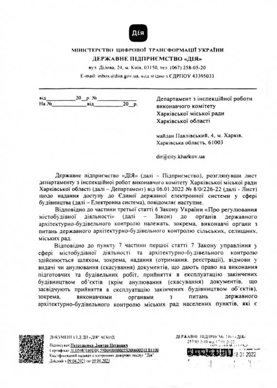 Мінцифри надає органам місцевого самоврядування офіційний доступ до відповідного державного будівельного реєстру (Єдина державна електронна система у сфері будівництва). ДП "Дія" дало письмову відмову Департаменту з інспекційної роботи виконкому Харківської міськради у доступі до зазначеного реєстру.
