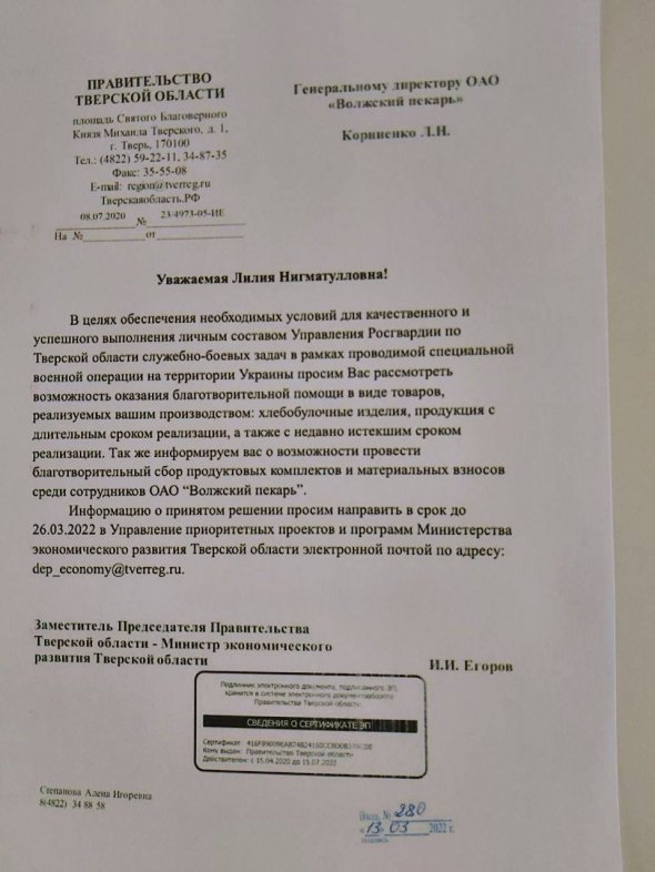 Уряд Тверської області РФ написав листа до "Волзького пекаря" про "благодійну допомогу" армії - хлібобулочні вироби з простроченим терміном реалізації.