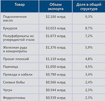 Точно так же не можна ігнорувати той очевидний факт, що саме аграрне виробництво - найбільший постачальник валюти в країну, навіть якщо аналізувати експорт в товарному розрізі. У таблиці - ТОП-10 товарів українського виробництва, які дають 50,9% експортної виручки. Чотири з десяти позицій цього рейтингу зроблені агросектором.