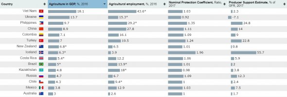 В Україні - найнижчий в світі номінальний коефіцієнт державної протекції в агросекторі, всього 0,92. Яку можна порівняти величину - лише 0,98 - має Казахстан, де внесок агровиробництва в ВВП менше 5%. У той час як у більшості країн цей показник перевищує одиницю, а в Ісландії і Кореї близький до двох. Усереднений серед країн ОЕСР коефіцієнт державної протекції в агросекторі становить 1,1.