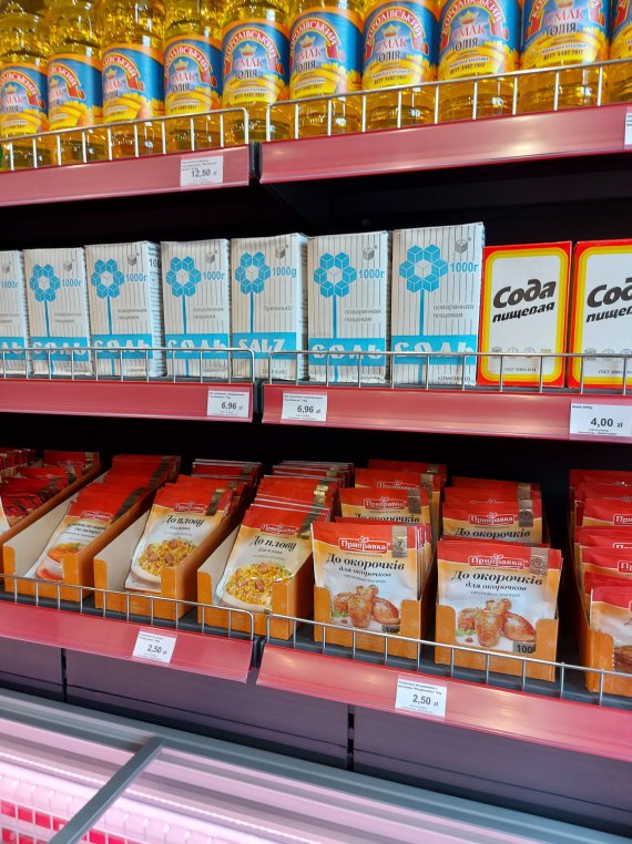 Полиці у магазині густо заставлені товаром. Є українські кетчупи, квашені помідори, сало, цукерки, риба до пива. Кам'яна сіль коштує 52 грн за пачку. Сушену плотву та воблу продають по 900 грн/кг, сушений кальмар - 1125 грн. Також у магазині можна купити червону ікру. Її немає в місцевих супермаркетах. Баночка обійдеться у 500-600 грн.