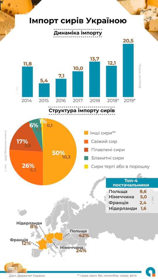 Україна переважно постачає сири з Польщі - 8,6 тис. т, або 42 % в загальній структурі імпортованих сирів. Ще 5 тис. т продукції завезла з Німеччини. На Францію прийшлося 2,4 тис. т, Нідерланди - 1,6 тис. т.