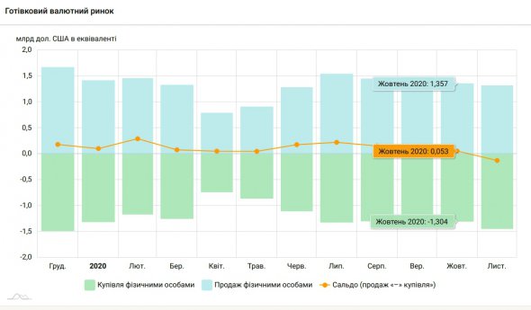 Українці купили валюти на суму еквівалентну $1,32 млрд. Це на 3% менше, ніж у жовтні. Продали валюти на $1,44 млрд, що майже на 12% більше, ніж попереднього місяця.
