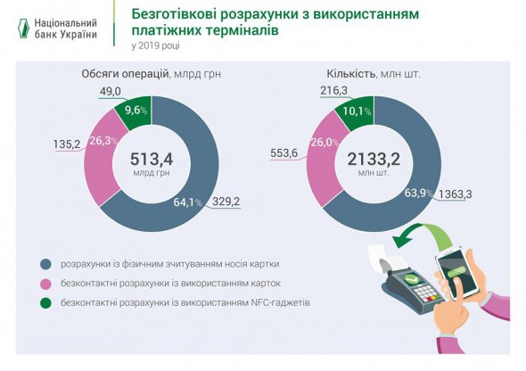 8 з 10 операцій платіжними картками були безготівкові. За підсумками року їхній обсяг досяг 1,8 трлн грн. Це 50,3% від усіх операцій із картками. 2014-го показник становив 25%, повідомила пресслужба Нацбанку.