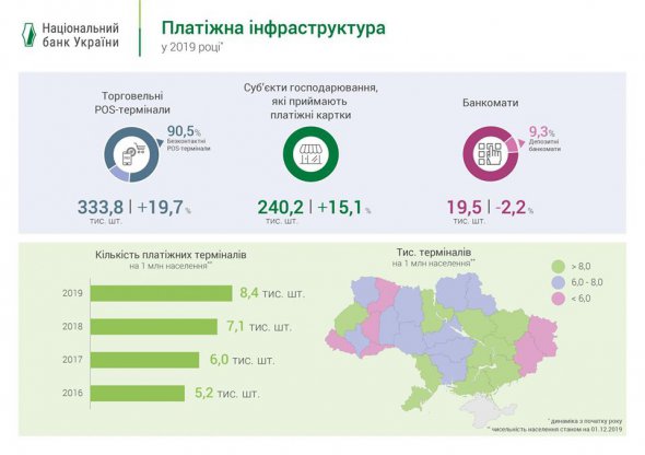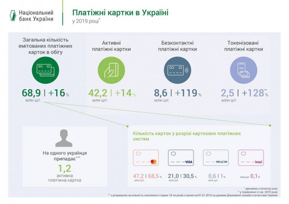 На 1 січня 2020-го в Україні нараховували 68,9 млн шт. платіжних карток, або на 16% більше, ніж на початку 2019-го. Активні з них 61,2%.