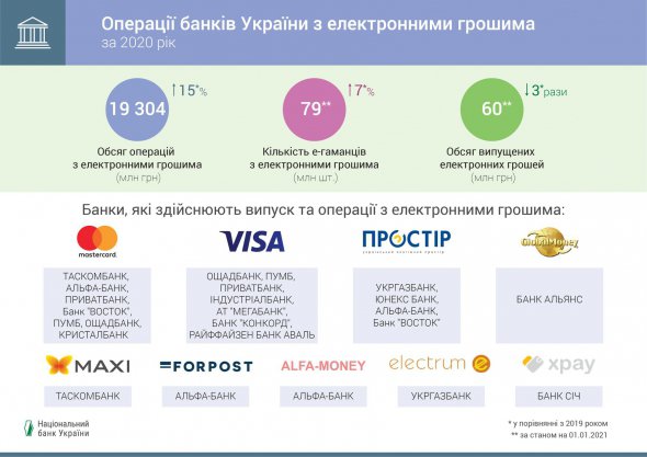 "Є певне зменшення обсягу випущених електронних грошей. Це пов'язано з тим, що в 2-му півріччі 2020-го ринок залишили кілька великих учасників", - ідеться в повідомленні Нацбанку.