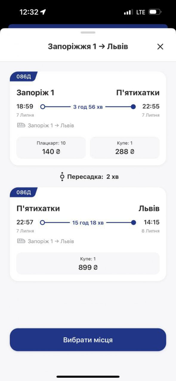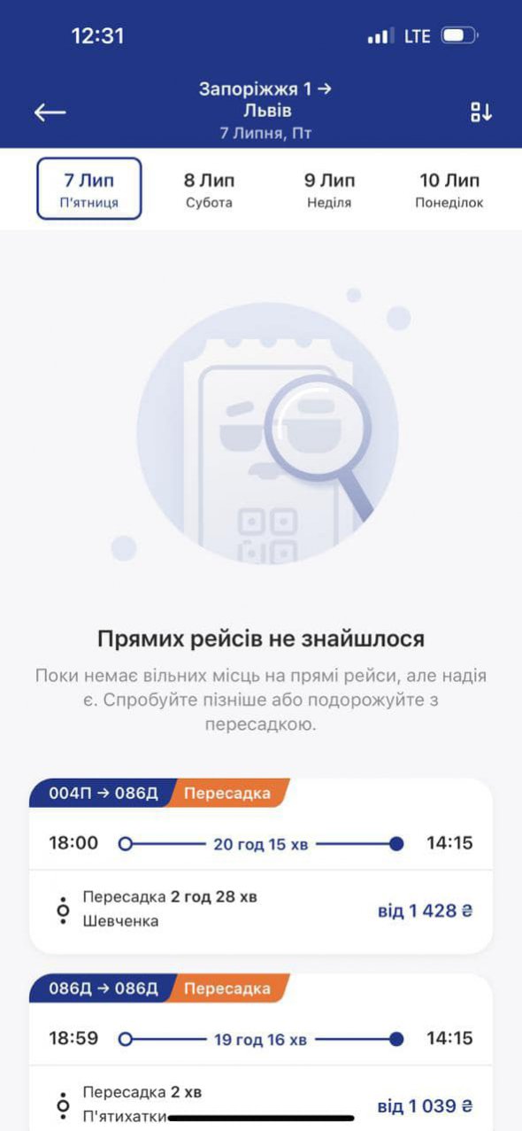 До прикладу, пасажиру терміново треба їхати із Запоріжжя до Львова. Квитків на весь маршрут вже не залишилось, оскільки до відправлення потяга лишається близько шести годин.