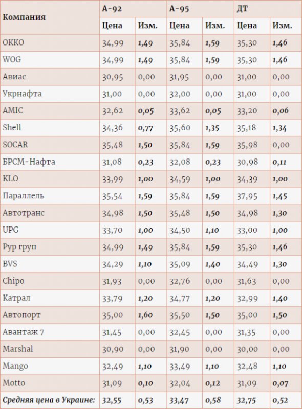 За інформацією Консалтингової групи "А-95", середня ціна бензину А-92 зросла в країні на 53 коп./л і склала 32,55 грн/л, бензин А-95 подорожчав на 58 коп./л - до 33,47 грн/л , а дизельне пальне – на 52 коп./л, до 32,75 грн/л.